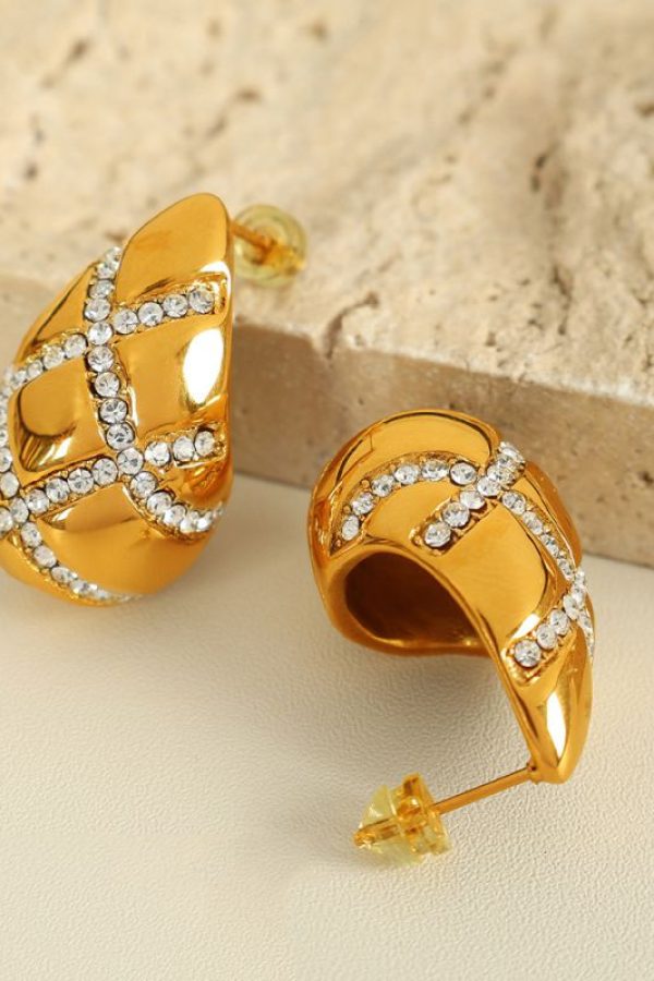 Crafted in 18k gold plating, these teardrop-shaped earrings feature curved bands of AD stones that crisscross over a smooth, high-polish surface. The raised, sculptural form gives them depth and drama, while the sparkle adds a hint of glam.