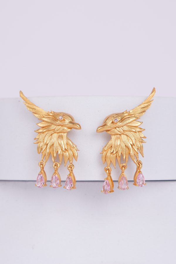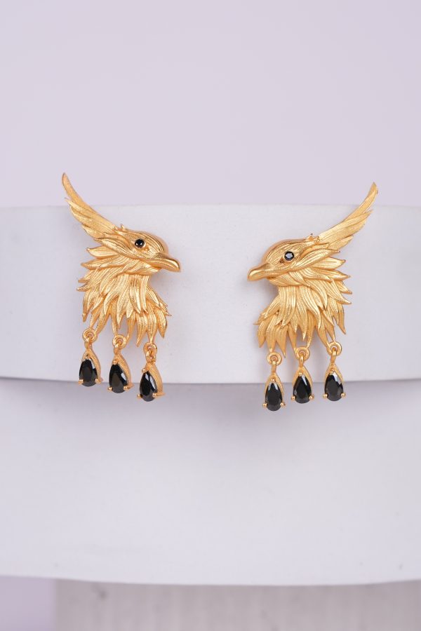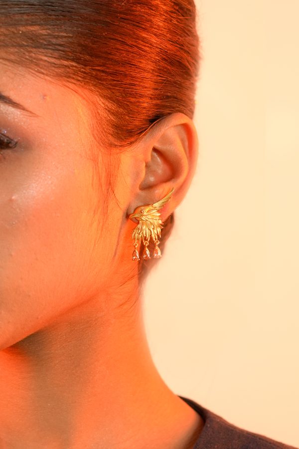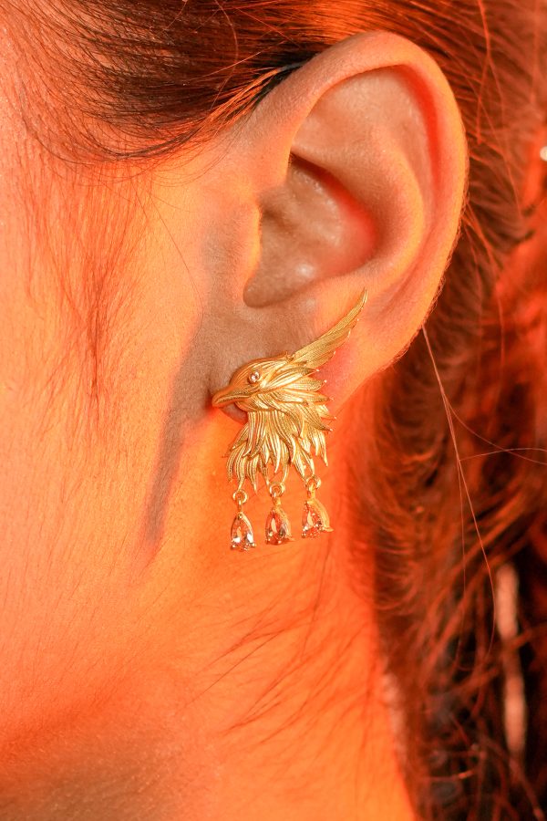 Sculpted in a bold eagle form, these gold-finished earrings feature three delicate stone drops that add movement and colour. A striking mix of structure and detail.