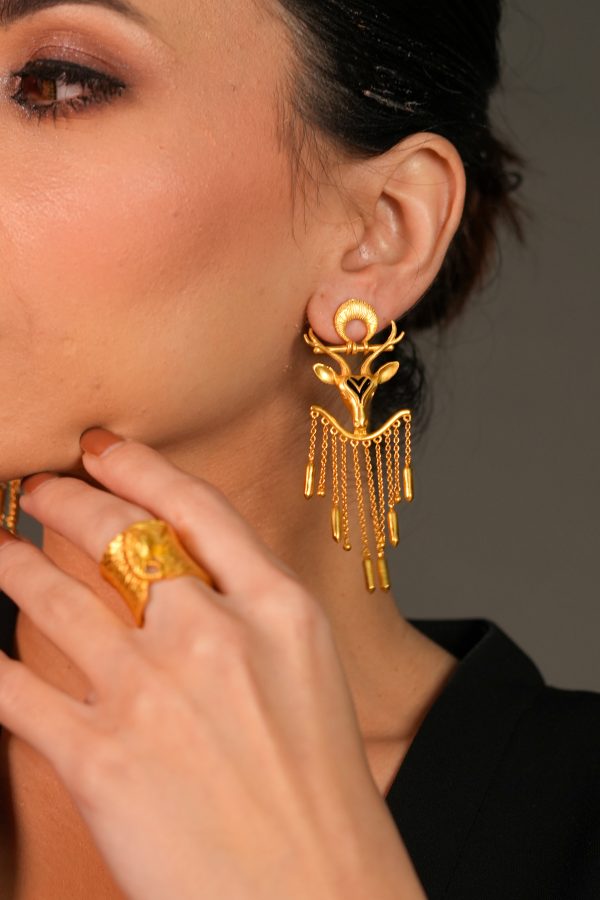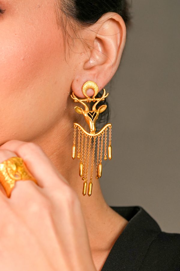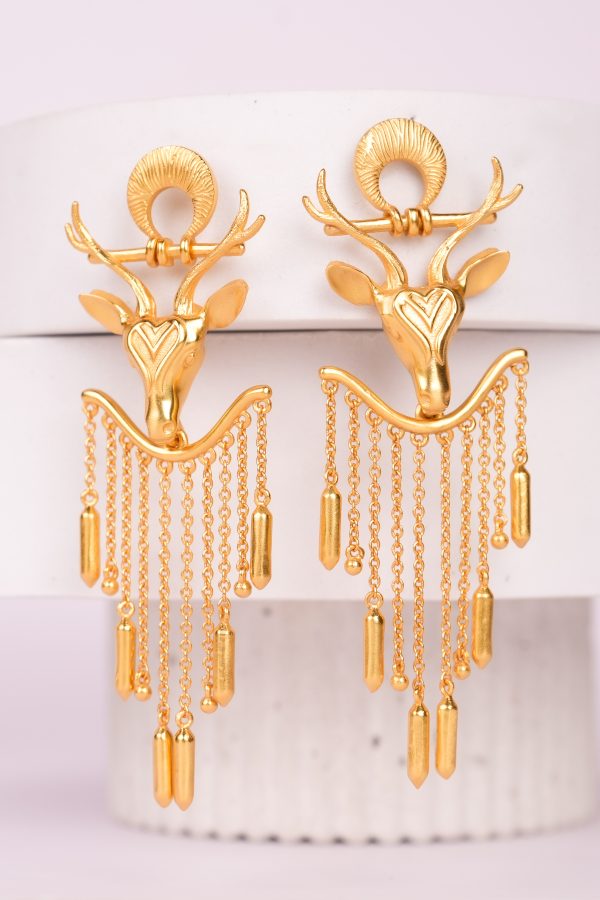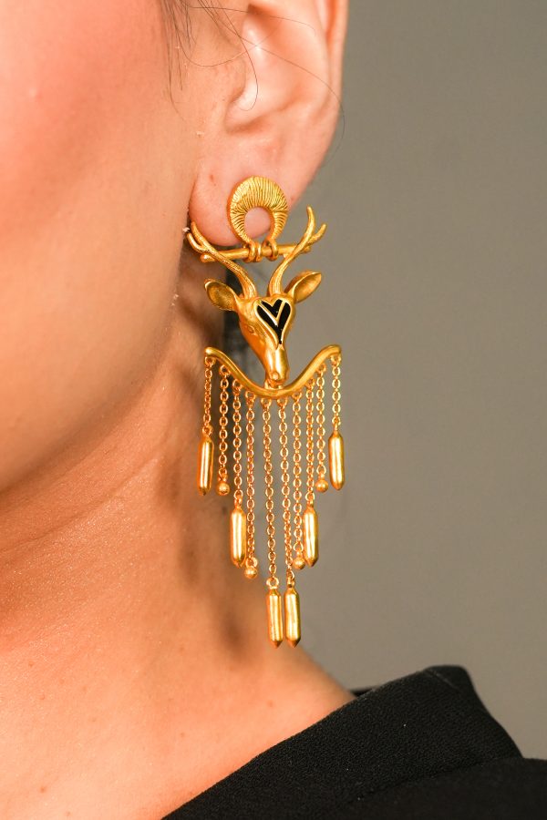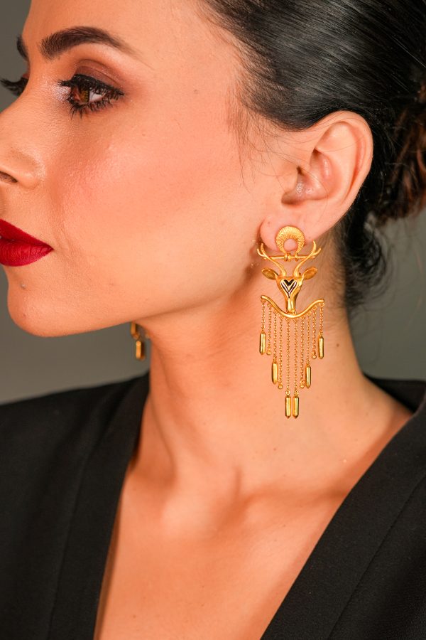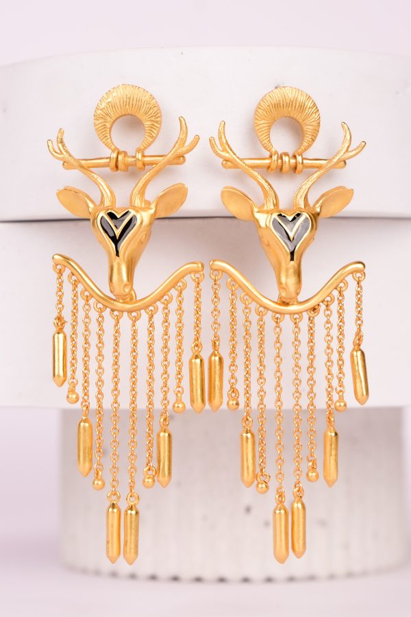 A striking blend of wild elegance and modern design, these deer motif earrings feature a bold heart detail and cascading golden chains – crafted to stand out in every setting.