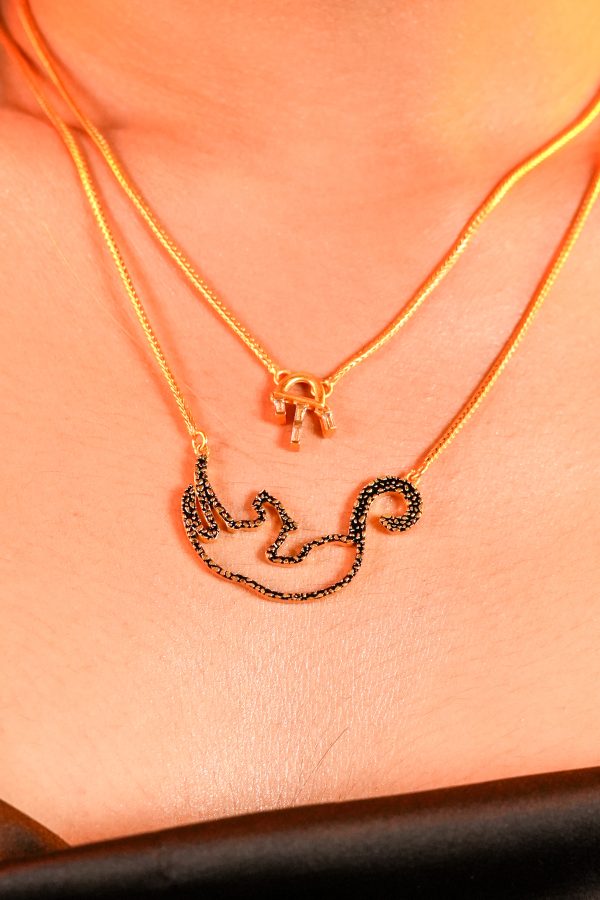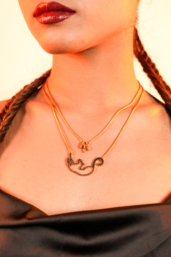 This twin necklace set captures duality in the most elegant form. The top chain holds a miniature polished gold padlock design – a symbol of secrets kept, thresholds crossed. Beneath it rests the star: a sleek, line-drawn cheetah mid-prowl, its lithe shape outlined in inky black stones.