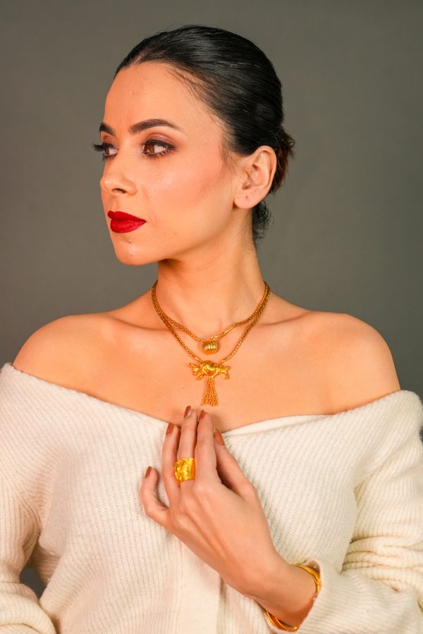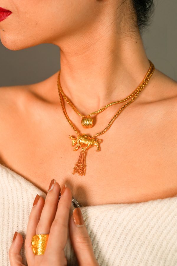 Strength meets ceremony in the Toro Twin Necklace – A bold two-chain necklace featuring a sculpted bull pendant with tassels and a textured gold orb, stacked for a statement look.