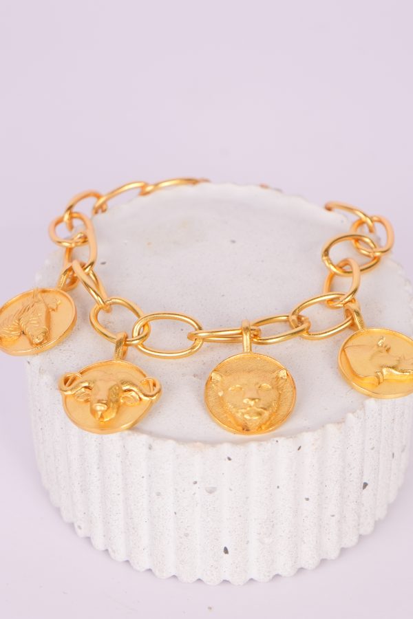 Crafted in 18k gold-plated finish, this bracelet features a series of softly polished medallions – each etched and elevated with an animal form: the lion, the ram, the rhino, the horse. Set on an open-link chain, it’s a piece that feels both ancient and entirely now, a quiet nod to power in motion.